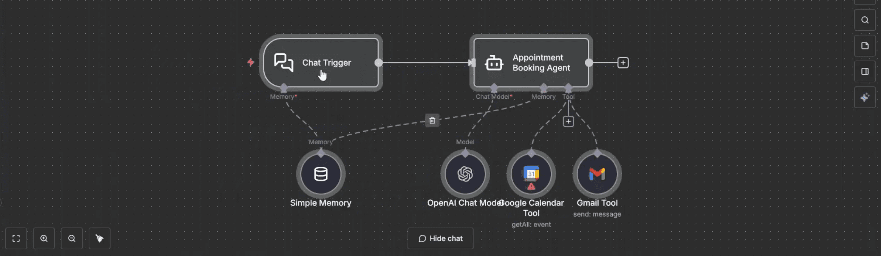AI Agent node: The central brain (likely named "Appointment Booking Agent") that orchestrates the logic.