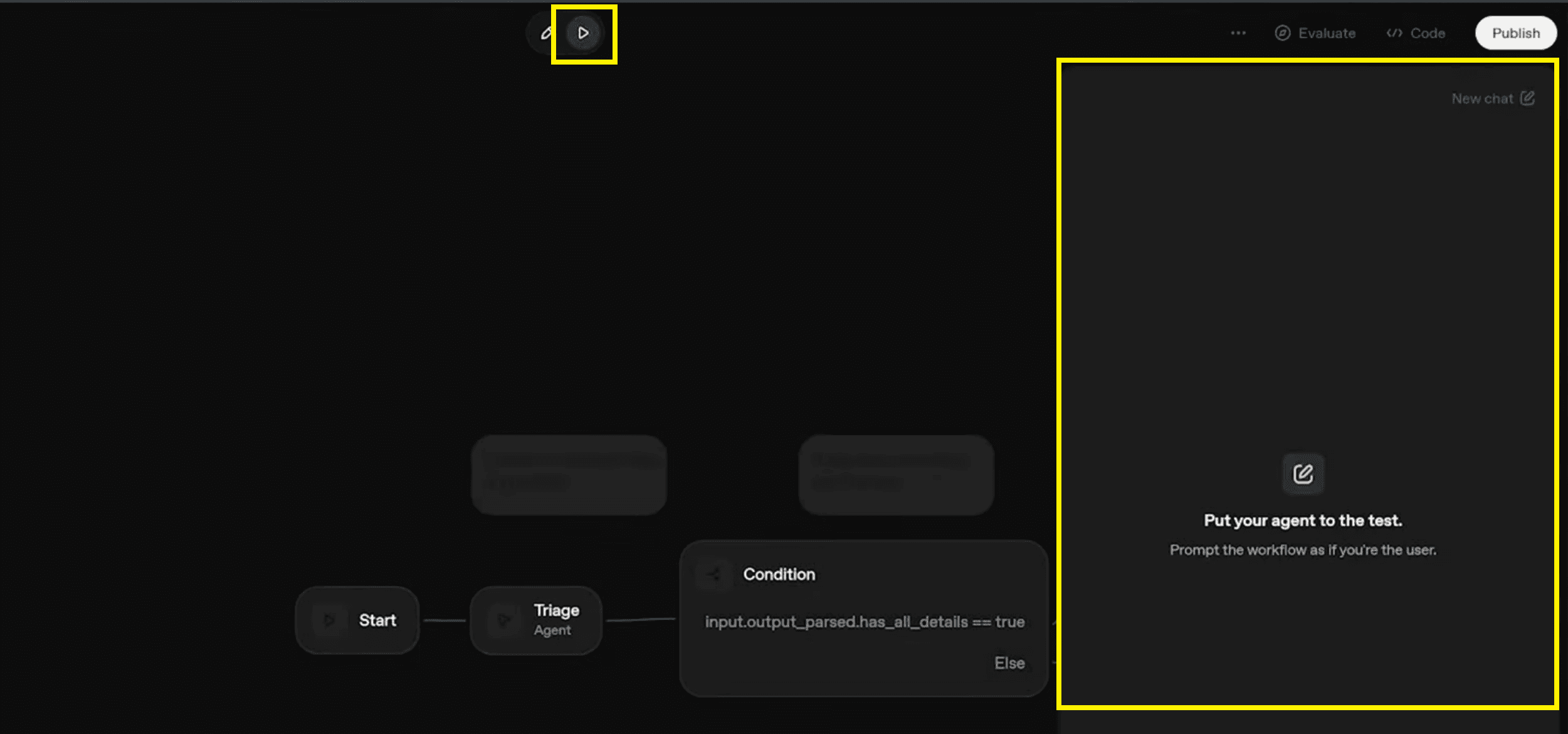 Once your workflow is set up, you’ll want to test it thoroughly before exposing it broadly. The Agent Builder provides a Play button inside the interface, where you can run your workflows with sample prompts and watch how each node executes. This makes debugging far easier, especially when complex logic or multiple agents are involved.